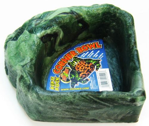 The Zoo Med Repti Rock Corner Bowl was specifically designed to fit in the corner of a cage or reptile terrarium while presenting a naturalistic feeding station for your basking frog or turtle. Its durable, easy to clean and can be used for your pets food or water.